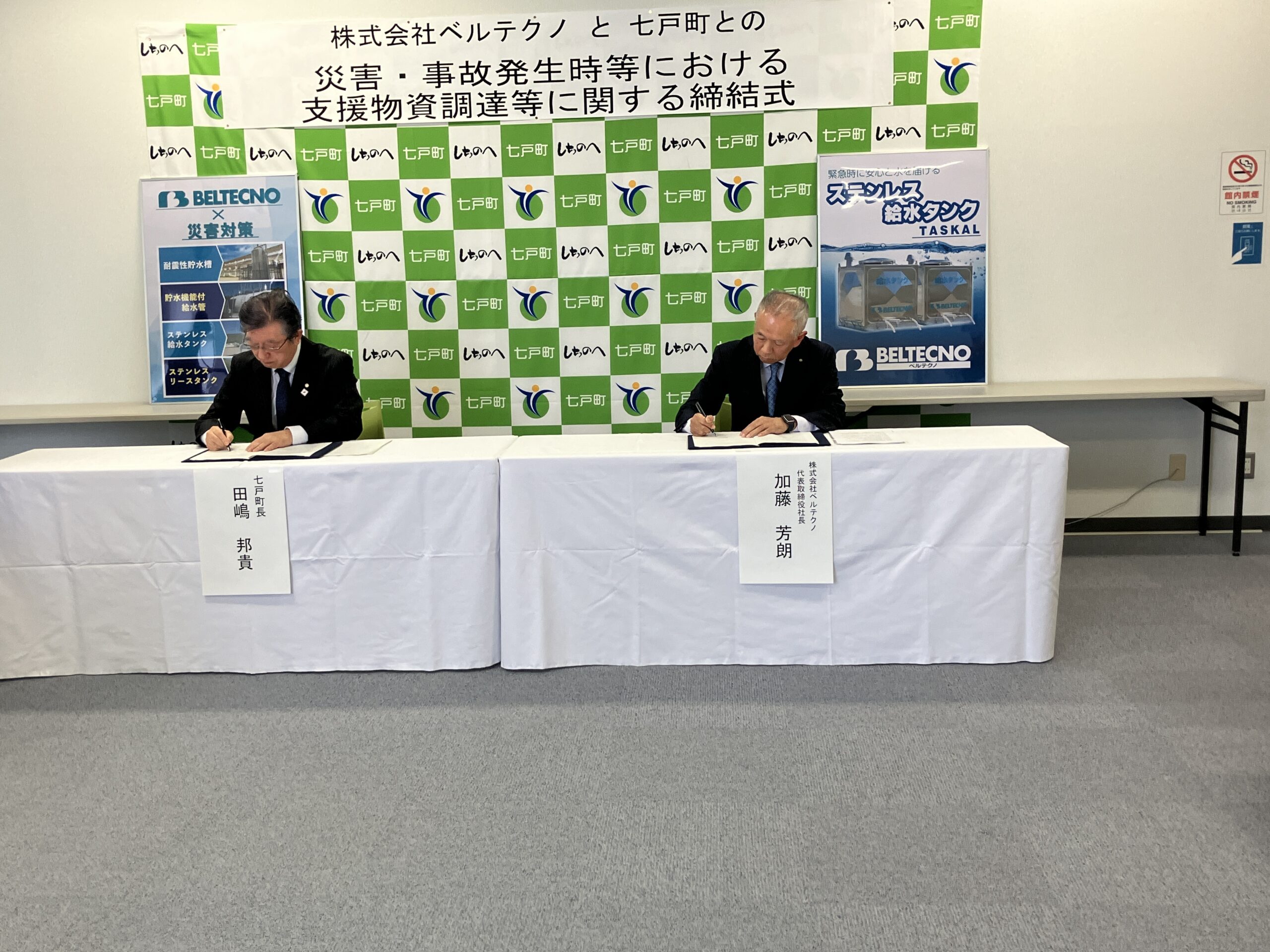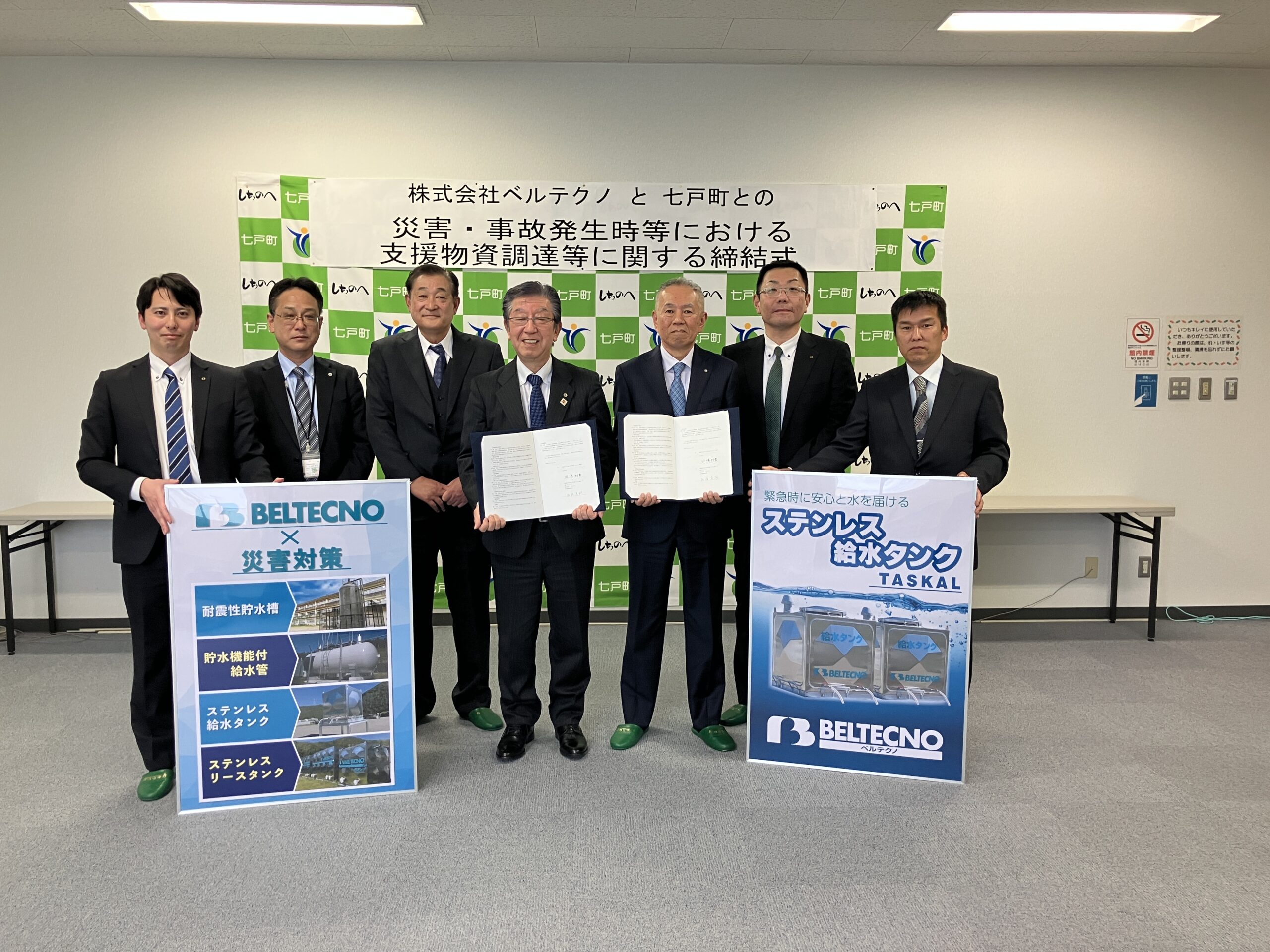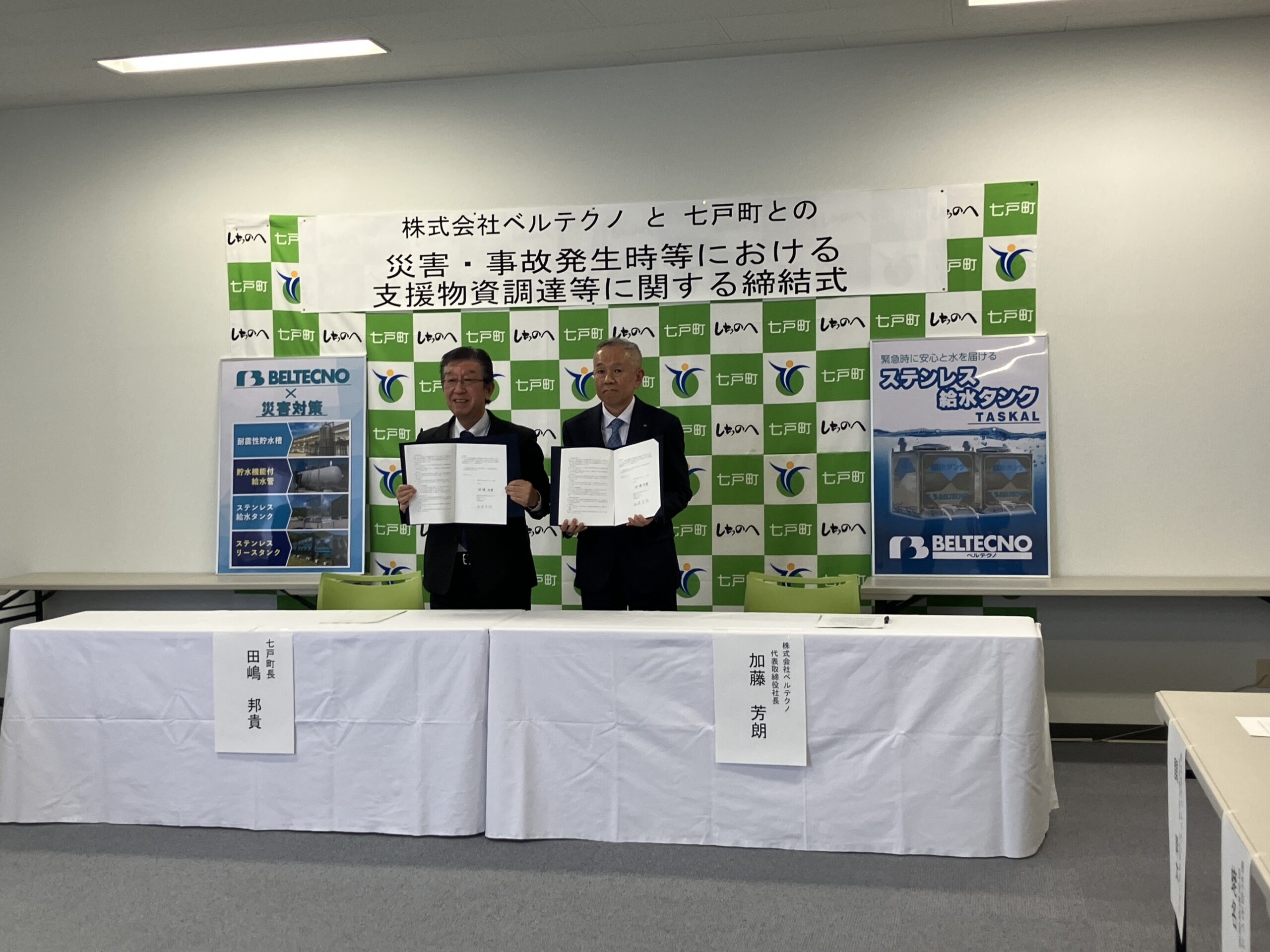 2026.02.12 新着情報 七戸町と「災害時における飲料水確保・給水タンク提供」に関する連携協定について 青森県上北郡七戸町と株式会社ベルテクノは、 「災害時における飲料水の確保および給水タンクの提供」に関する連携協定を締結いたしました 2026年2月12日、青森県上北郡七戸町と株式会社ベルテクノは、 「災害時における飲料水の確保および給水タンクの提供」に関する連携協定を締結いたしましたので、 お知らせいたします。