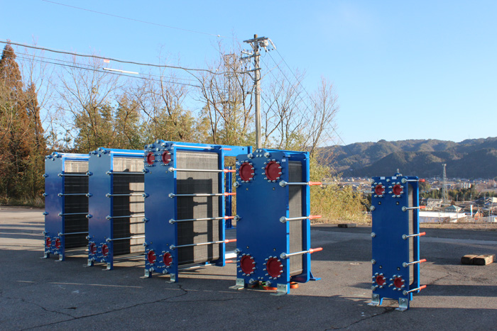 一方、プレート式熱交換器は後者(水と水)に適しており、プレート(SUS、チタン)に各媒体を交互に通すことで加熱・冷却を行います。